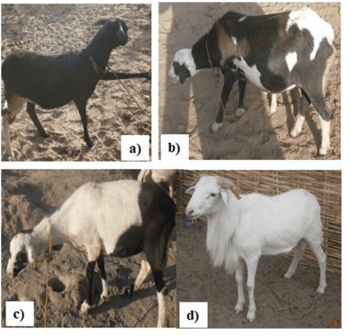 a Uniform black with tan belly; b Spotted/pied; c Patchy white-black with badger face; d Uniform white (PROGEVAL, 2017)