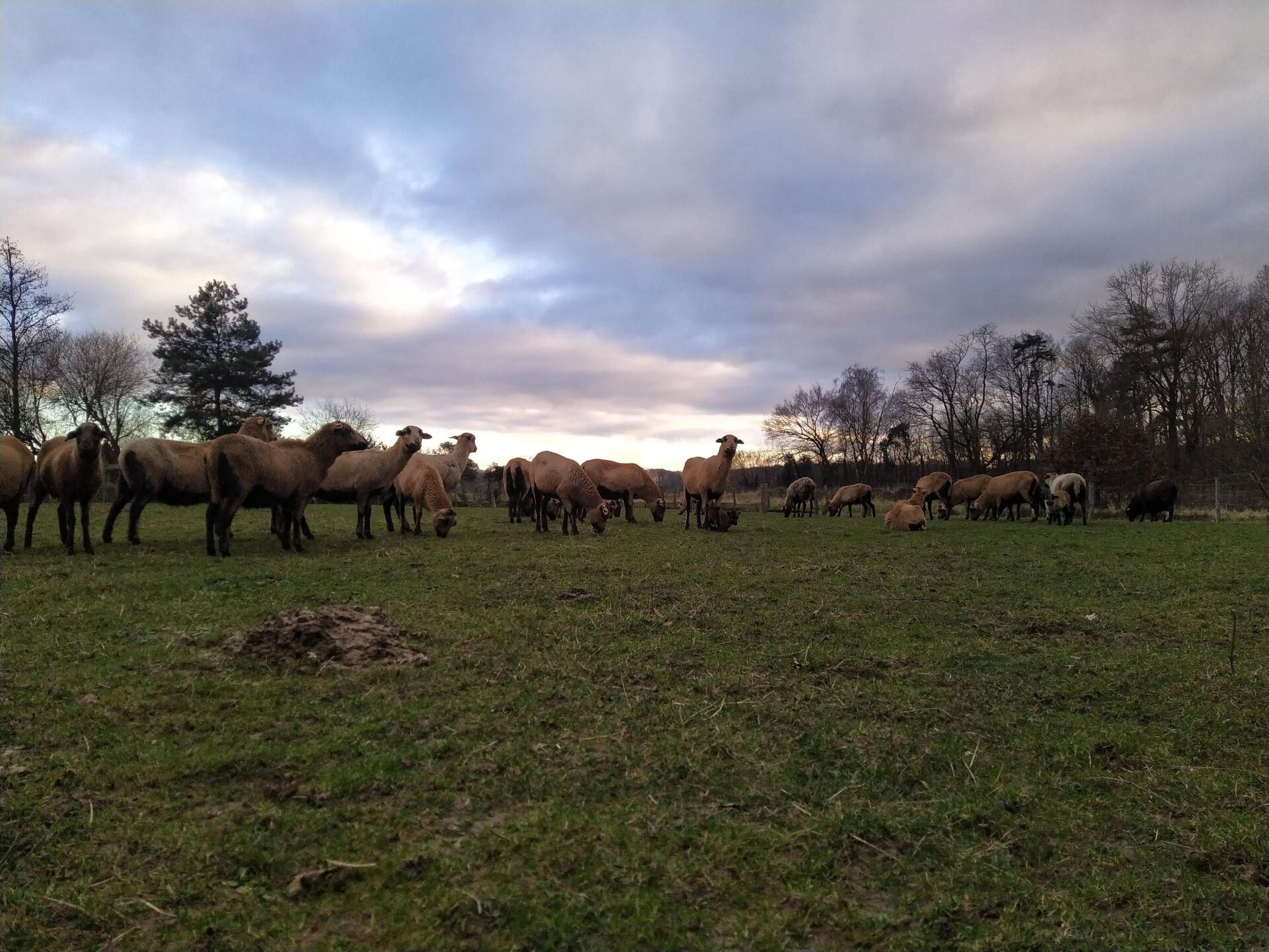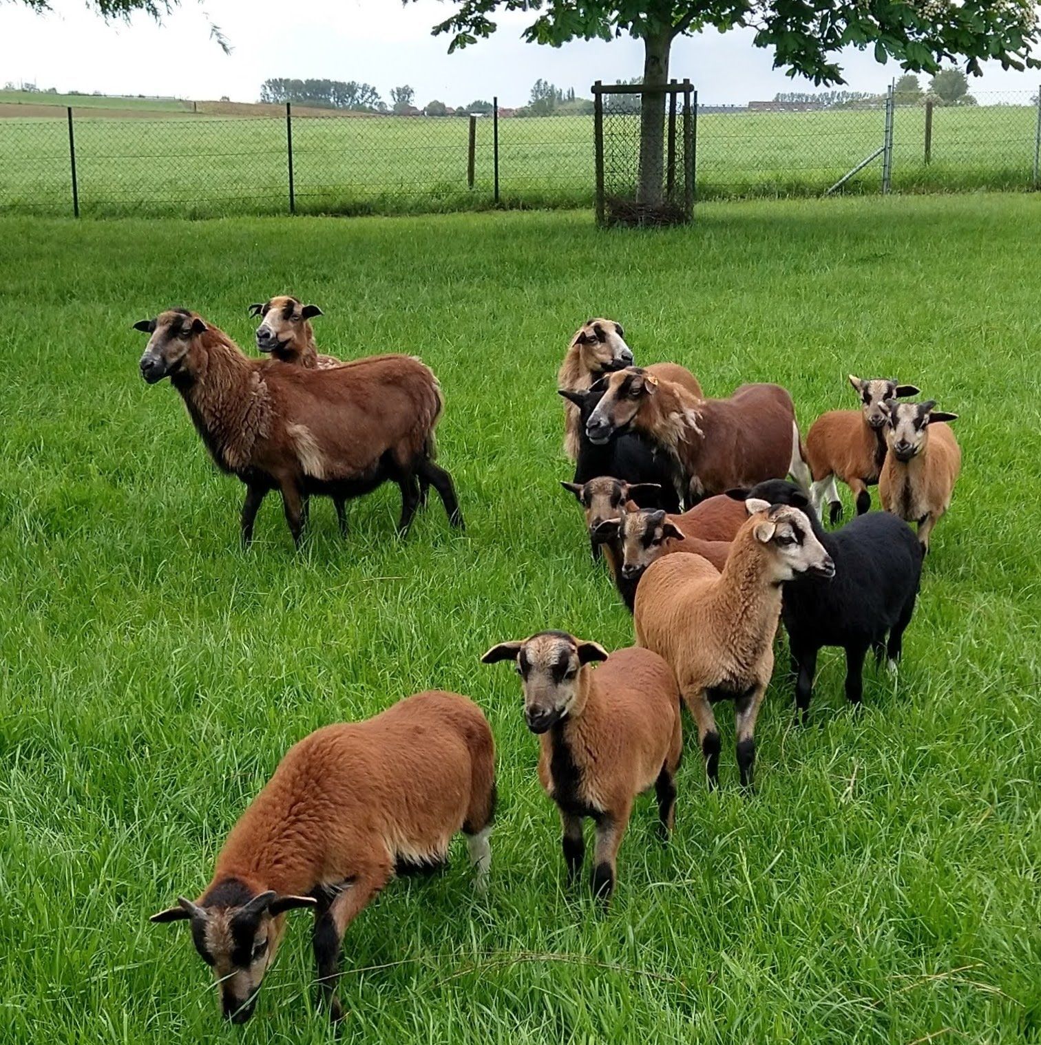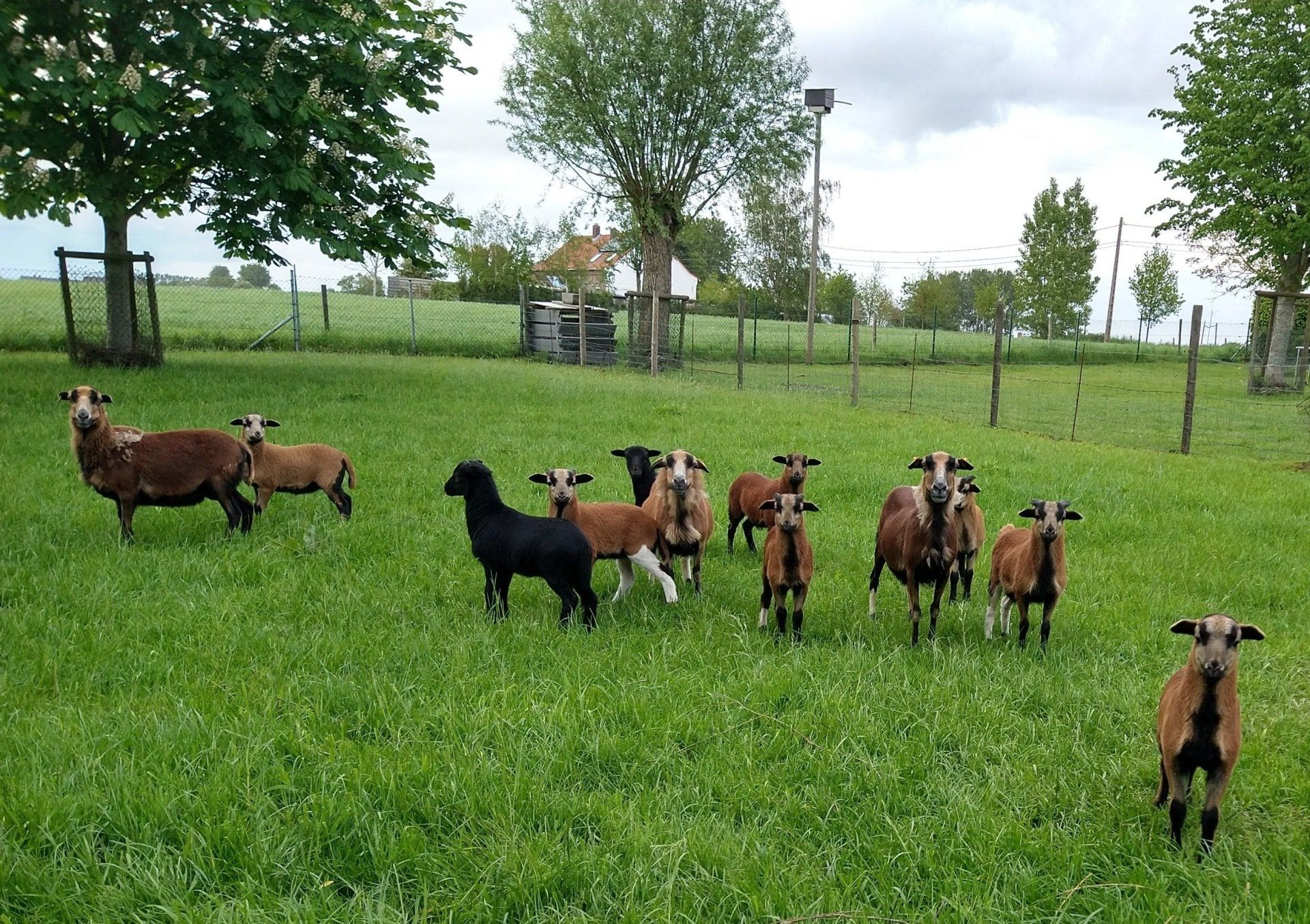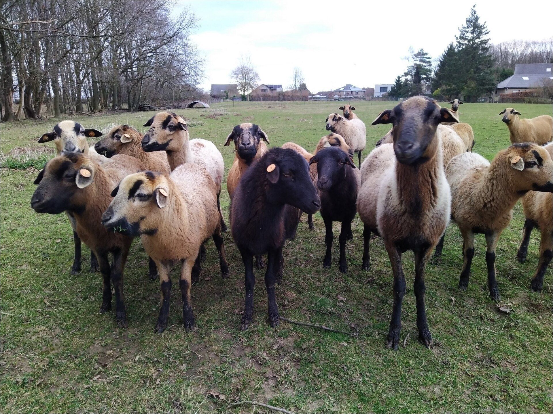 Djallonké sheep herd with ewes from different bloodlines (Bossaert, Van 't Wilgenhof, Den Bronstige van Holsbeeks...) and the ram Nikwe's Black Jumper.