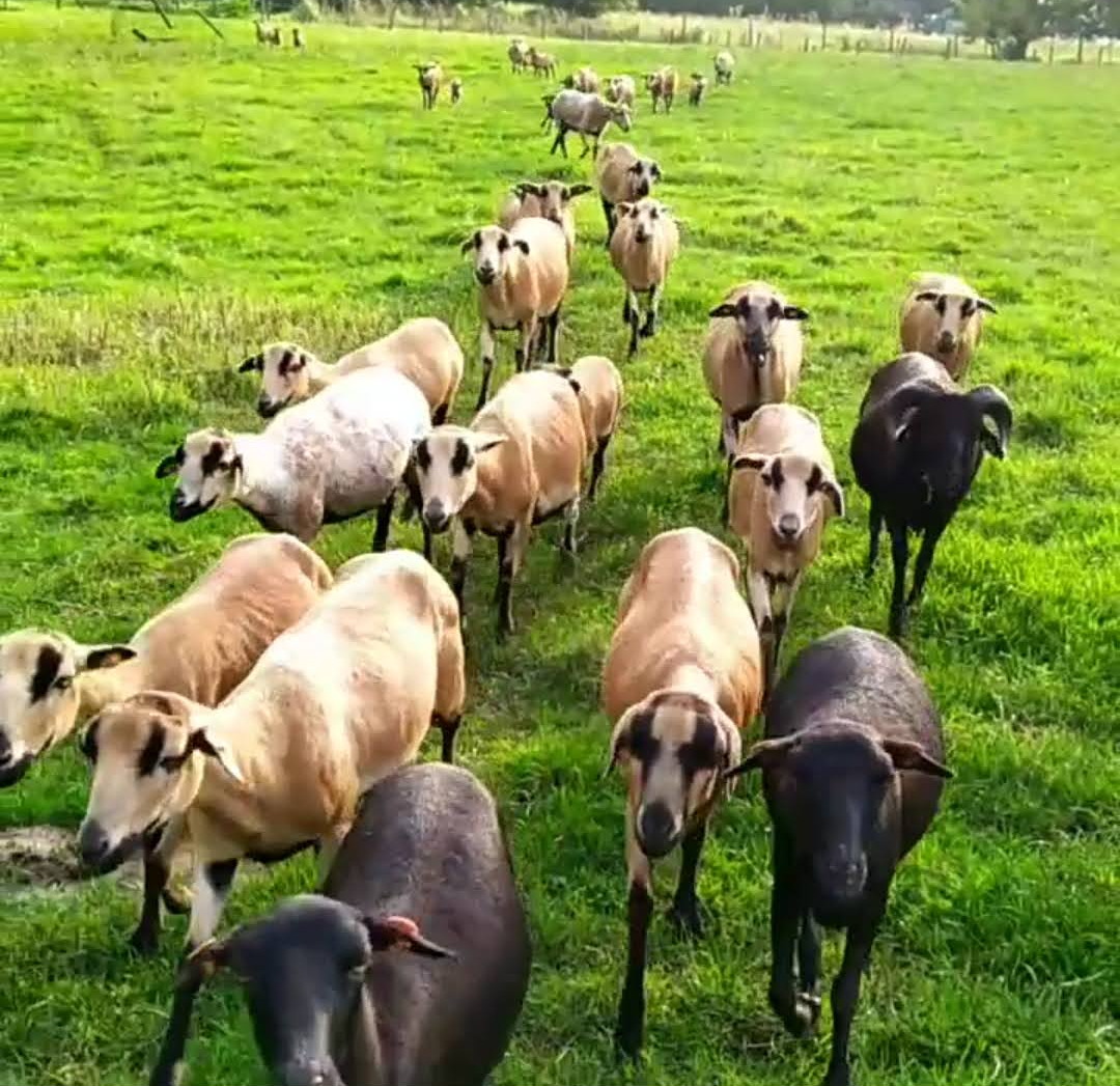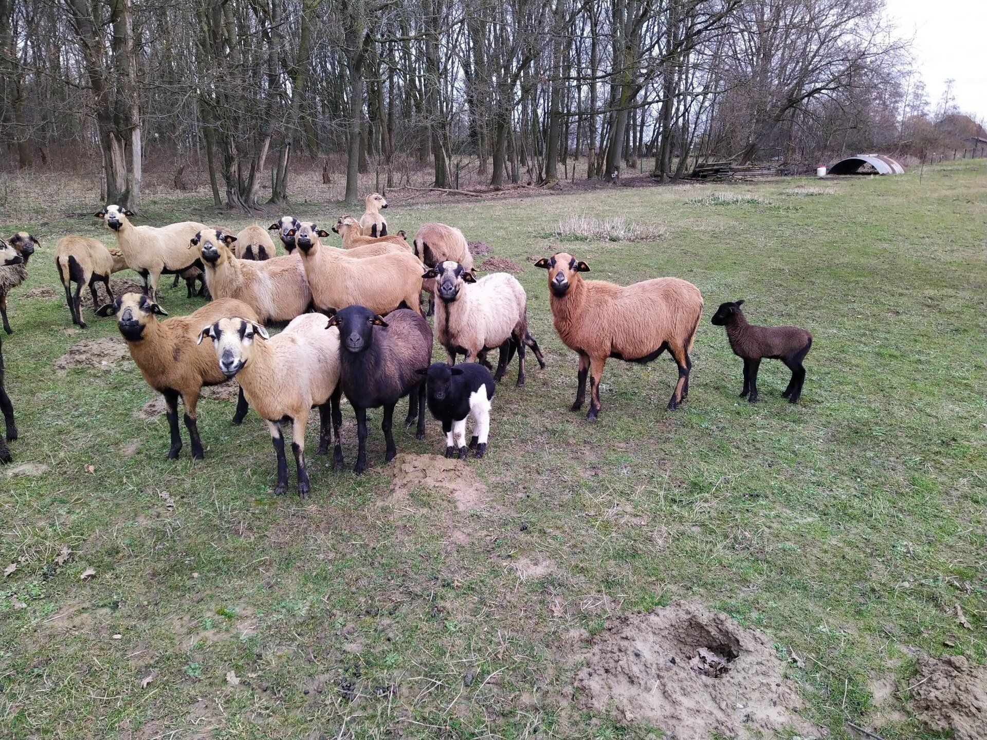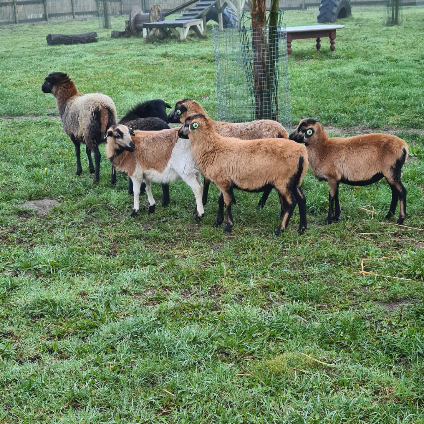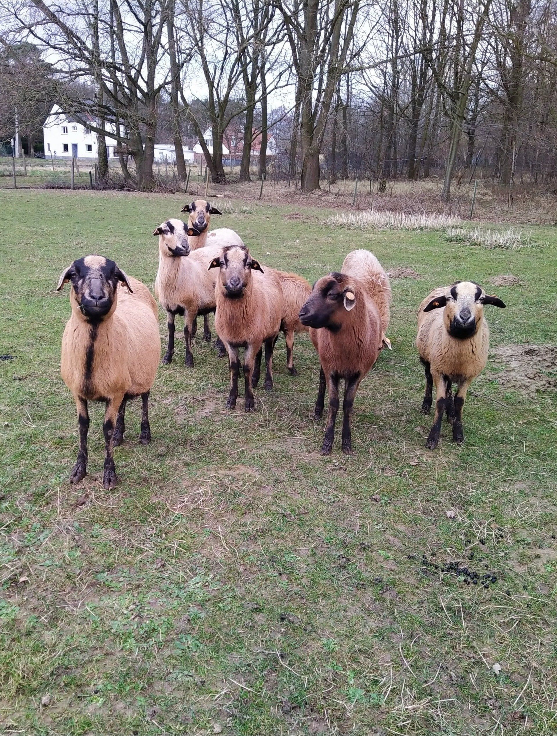 Djallonké sheep herd with ewes from different bloodlines (Bossaert, Van 't Wilgenhof, Den Bronstige van Holsbeeks...) and the ram Nikwe's Black Jumper.