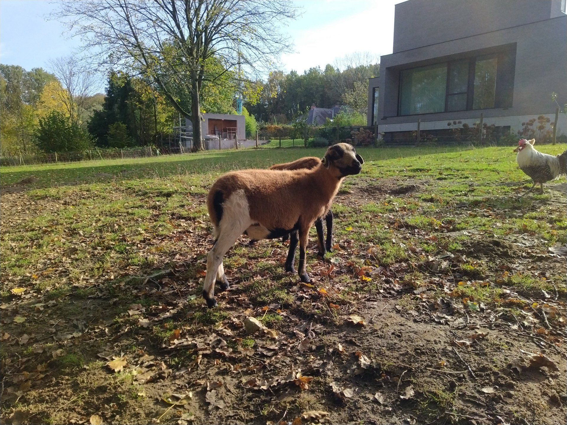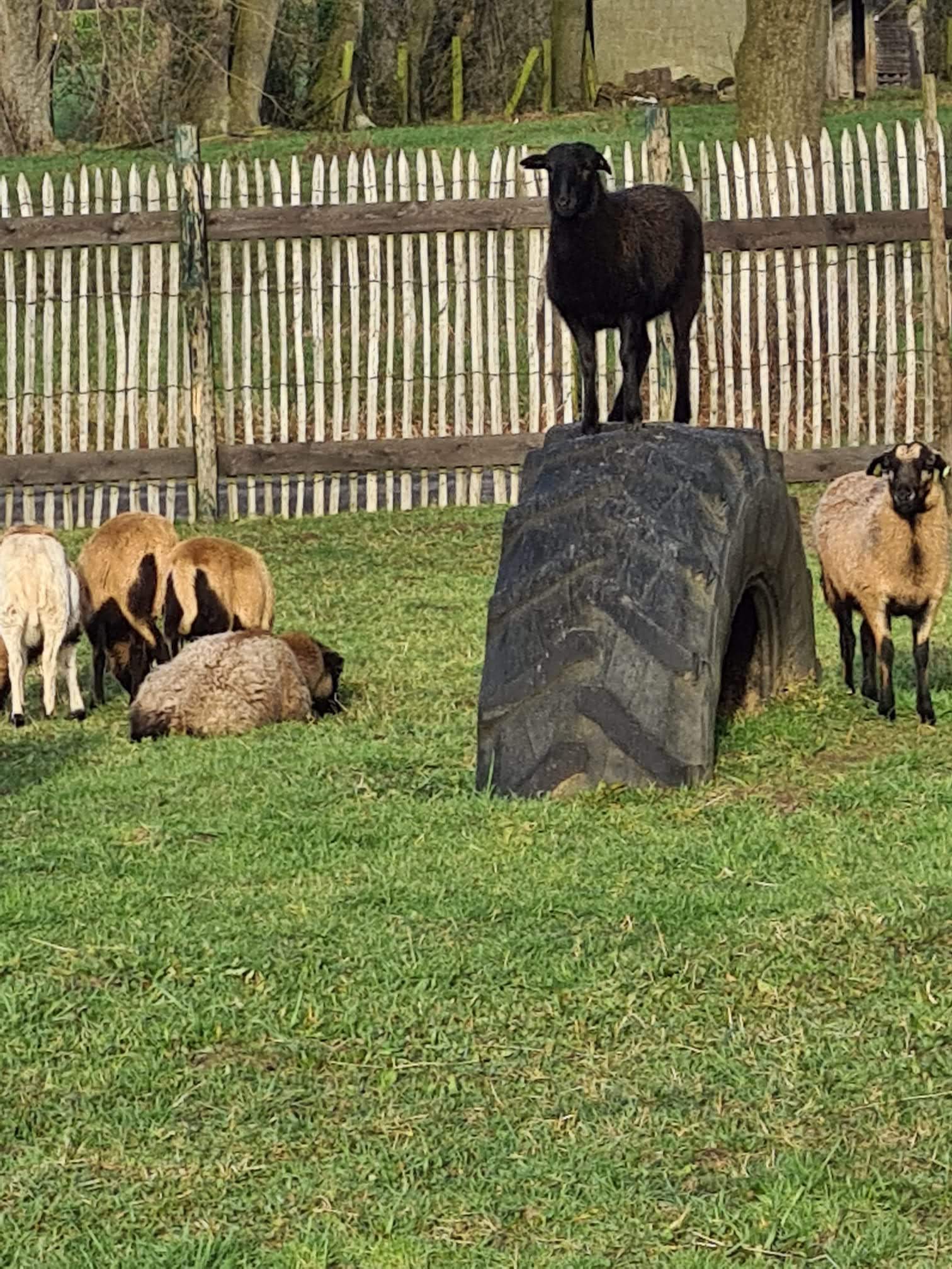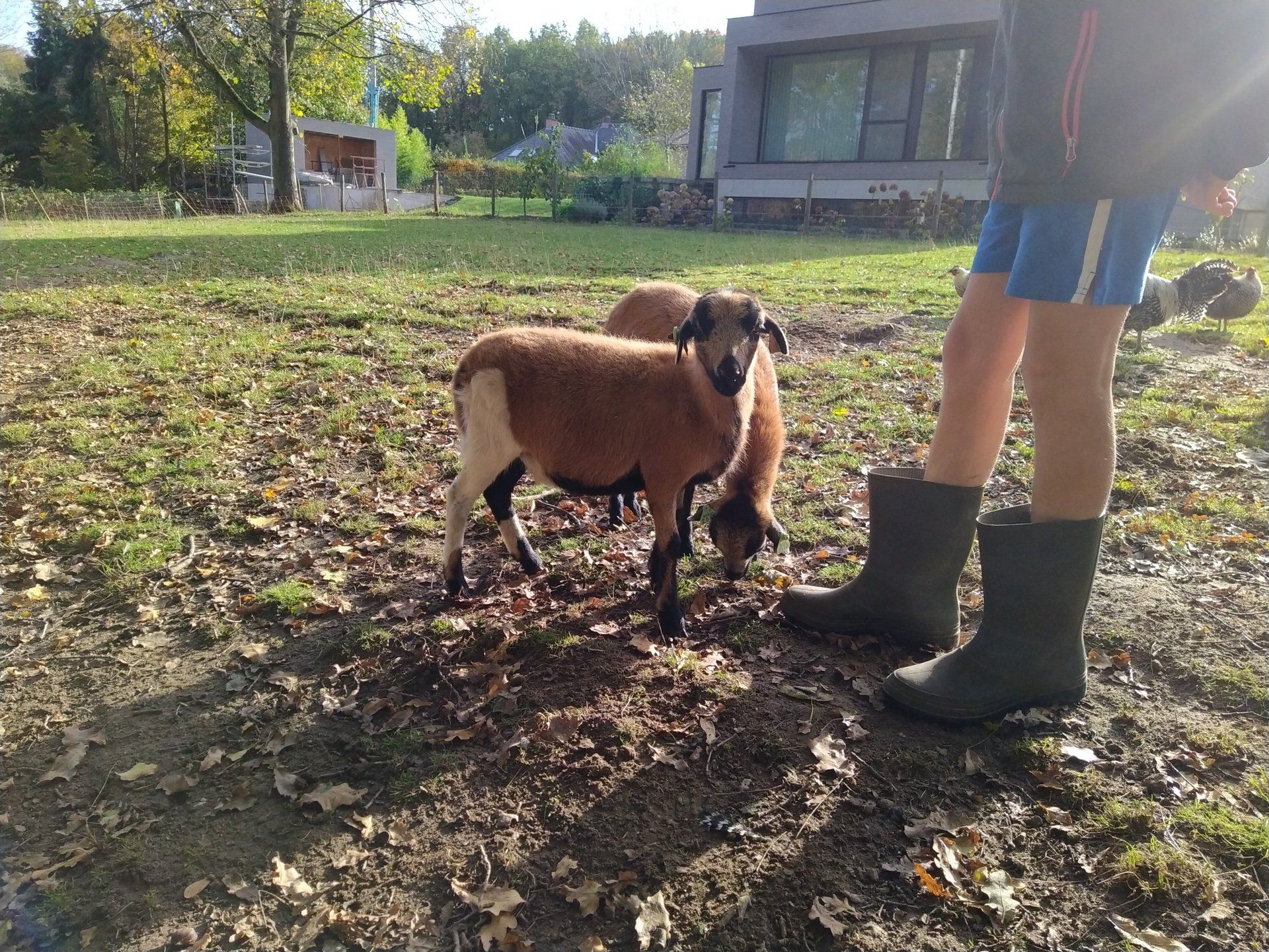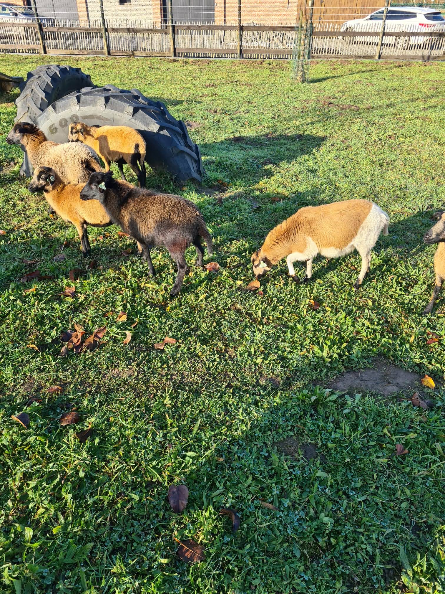Djallonké sheep herd with ewes from different bloodlines (Bossaert, Van 't Wilgenhof, Den Bronstige van Holsbeeks...) and the ram Nikwe's Black Jumper.